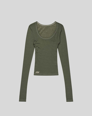 Oliven Grøn Milo Top Kernemilk Milo Top kombinerer et rent udtryk med høj kvalitet. Den olivengrønne top har en rund halsudskæring med kontrasteren...