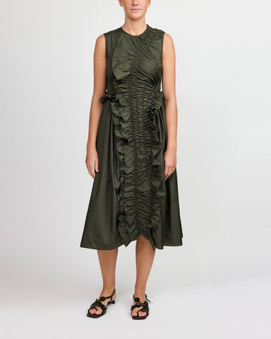 Cecilie Bahnsen Ole Pine Green Dress Denne mørkegrønne kjole har håndlavede smock- og flæsedetaljer. Den kombinerer en tætsiddende overdel med en n...