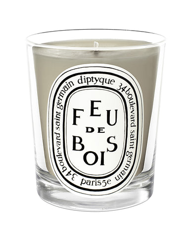 Parisisk Duft af Sandalwood Diptyque Santal Standard Candle præsenterer sig i en gennemsigtig glasbeholder med den karakteristiske etiket fra det p...