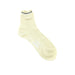 Das Waffelmuster prägt die obere Hälfte der Socke und schafft eine dreidimensionale Textur, die sich vom glatten unteren Bereich abhebt. Diese Gestaltung verleiht dem Ivory-Farbton zusätzliche Tiefe. Das schmale Band in kontrastierendem Muster unterstreicht die sorgfältige Verarbeitung und fügt sich in das minimalistische Gesamtbild ein, ohne aufdringlich zu wirken.