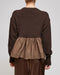 Den brune jumper kombinerer det bløde strik med arkitektoniske peplumflæser, der giver et feminint udtryk. Materialekombinationen sikrer både varme og komfort, mens designdetaljerne skaber en særlig visuel effekt, der kendetegner Cecilie Bahnsens æstetik.