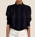Die Vanessa Bruno Asseneneo Blouse in Schwarz zeichnet sich durch dekorative Spitzen-Details aus, die entlang der Knopfleiste, am hochgeschlossenen Kragen und an den Ärmelbündchen verlaufen. Hergestellt aus einer Mischung von 55 % Baumwolle und 45 % Viskose bietet die Bluse ein angenehmes Tragegefühl. Die Dreiviertelärmel mit elastischen Bündchen sorgen für eine komfortable Passform. Die durchgehende Knopfleiste und der strukturierte Schnitt mit leicht gepufften Schultern verleihen dem Oberteil einen zurückhaltenden Look.